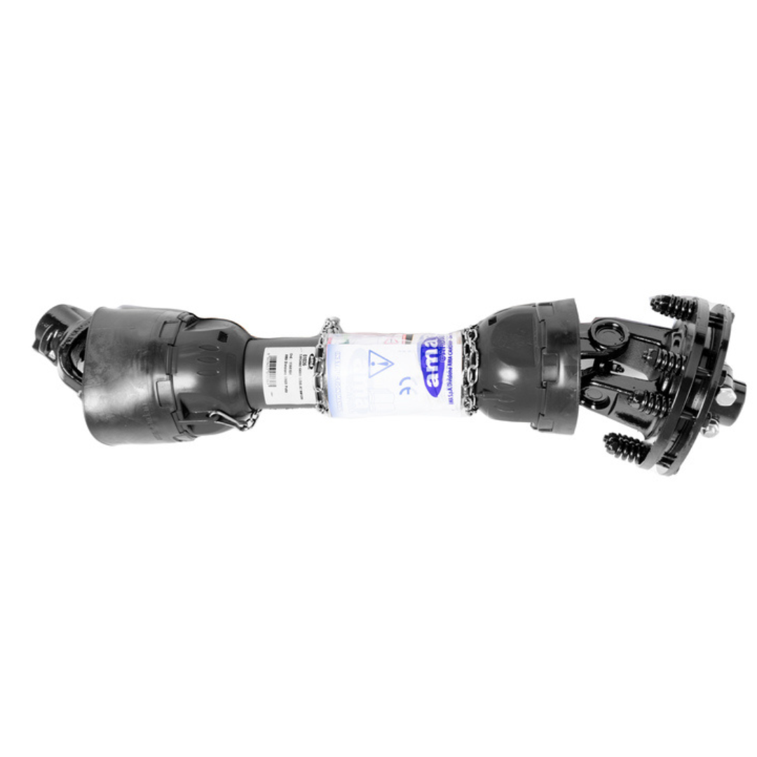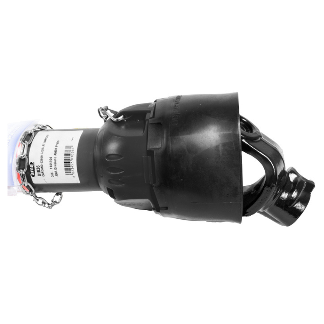 Albero cardanico di trasmissione omologato CE con elevata affidabilità, sicurezza, inalterabilità agli agenti atmosferici e limitata manutenzione. Sul lato attrezzo è applicato il dispositivo di sicurezza limitatore a dischi di attrito. Cardano Ama Cardna categoria 6, lungo 800 mm, diametro 200 e n. 2 ferodi, Nm 1200. Di tipo C, con tubo triangolare spinato.