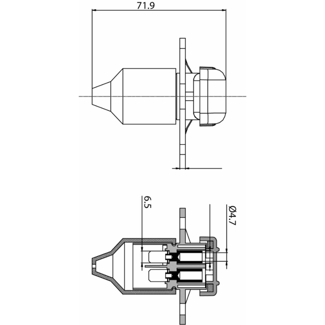 Presa 3 poli in plastica 12-24V con contatti femmina e con coperchio. Fissaggio 2 fori Ø 6,2 mm. Terminali a faston piatto 6,3 mm.